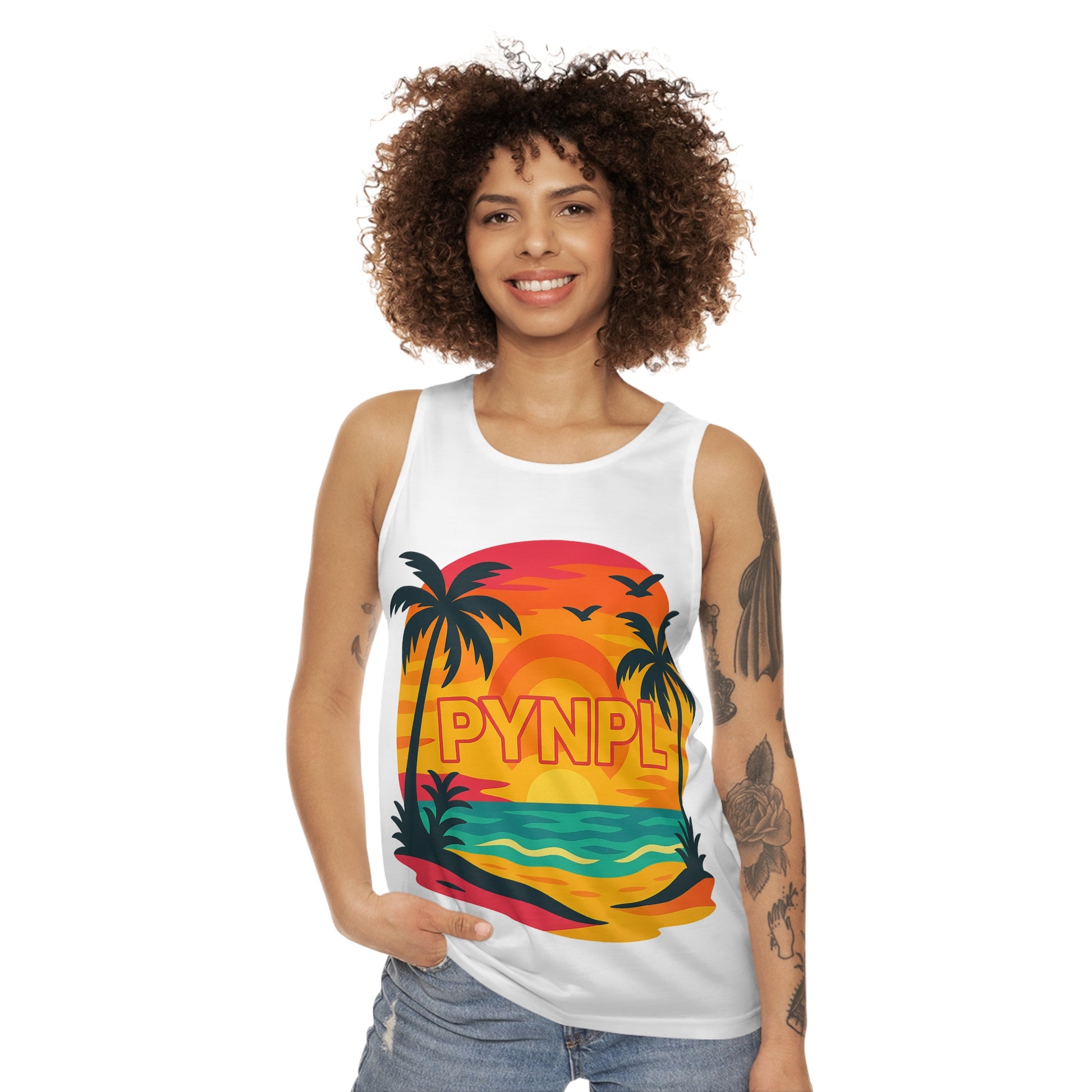 Elevate your casual wardrobe with this PYNPL sunsets Unisex Tank Top, featuring a stunning sunset design with palm trees that radiate a tropical vibe. Perfect for sunny days at the beach or relaxing gatherings with friends, this tank top is the ultimate go-to for comfort and style. Its lightweight and breathable material makes it ideal for warm summer days or layered under a jacket during cooler evenings.